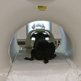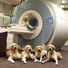 The “Dog Project” began in 2012. Initially, two dogs were trained using positive reinforcement. The dogs learned to hold an extended down-stay in a custom-made chin rest inside a simulated MRI. They also learned to wear ear protection to guard against the noise an MRI makes as well as becoming acclimated to the sounds. Within a few months, we had performed the first scans in the world. We demonstrated that the reward system of the dog’s brain could distinguish between hand signals that meant the presence or absence of a food reward.